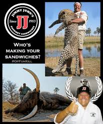 Then these owners like him slip money to certain campaign officials to keep their power and preeminence position in the American food chain. This has come at the expense over traditional mom and pop stores where the families and owners served their workers fine and new your name. It is right Wong nut jobs like this owner of Jimmy Johns that use their position and crony corporate dominance to empower and enriched themselves with their bad service,shitty company,bad food, and deep pockets to enable that few alternatives and choices are available to communities around this country. This is a guy who also uses his money and power to attempt to use tax subsidies for expensive luxury items and has savagely gone to African and enjoyed big game hunting of exotic animals . This by far he has received the largest amount of criticism of the many he has encountered by informed people through the Internet. This jagoff has no shame posing with the many rare and endanger creatures he killed for his own sick twisted form of stress relief and delectation. How any liberal or progressive especially one who enjoys and loves animals and the diversity of creatures on are big rock can continue to patronize this scumbag Jimmy John Liautaud's franchise and eateries knowing they fund this morons African safari trips is predictably pathetic needing of a fervent examination.