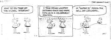 The strip is suppose to be in ancient flintstone times but all the gags for the most part pertain to modern cultural implications. In the fifty year time period this crumb of a comic artist has been allowed to print, there are endless modern gags that are all unfunny and irrelevant for a comic strip about cavemen. I find it prodigious that this strip was actually allotted fifty years in printed syndication. Hart seems to have wished he could of drawn a space comic strip because looking through the book you would be amazed at how many alien and other planet panels show up in this detestable comic strip.