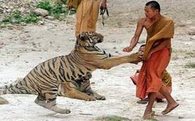 Jake Glass Wealthy Londonistan lawyers and other rich travelers love to visit Thailand and pay premium prices to see a Buddhist monastery that has turned into part exotic game petting zoo. this tiger temple has long been on the target of conservationists and animal rights activists who accuse the Buddhist monks of exploitation of these animals and offer the worlds rich travelers a wildlife fantasy spot and a stop to feed sick tigers for religious profit. The Thai government had enough and attempted to end this project but had to be stopped after a lawsuit was filed in February. this has pitted a military government against wealthy tourist enterprises wanting to keep these tiger temples in operation because there is so much money to be made from displaying the one hundred and fifty big cats this temple own enslaves and holds in captivity. This religious institution now rakes in six million dollars a year in tickets and clearly receives as much in donations from foreign money wanting to keep this hip and cool vacation destination operating for future generations. The moral authority of the monks in Thai society makes this a thorny issue for animal activists and the government in their battle to close this scam temple. The government had ordered the temple to stop breeding tigers and letting tourists dangerously feed the tigers up close but the stubborn Buddhist monks often act like they are above the law with their moral authority.